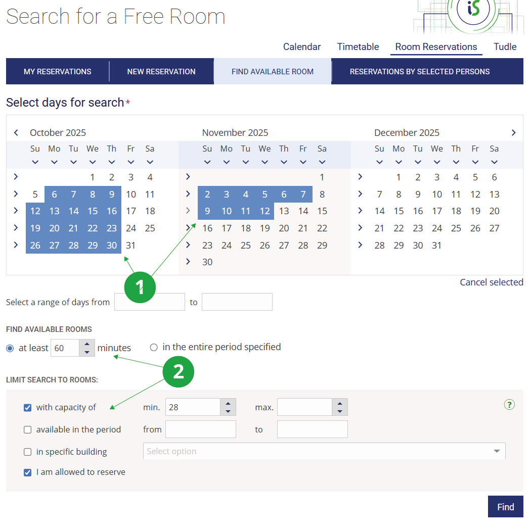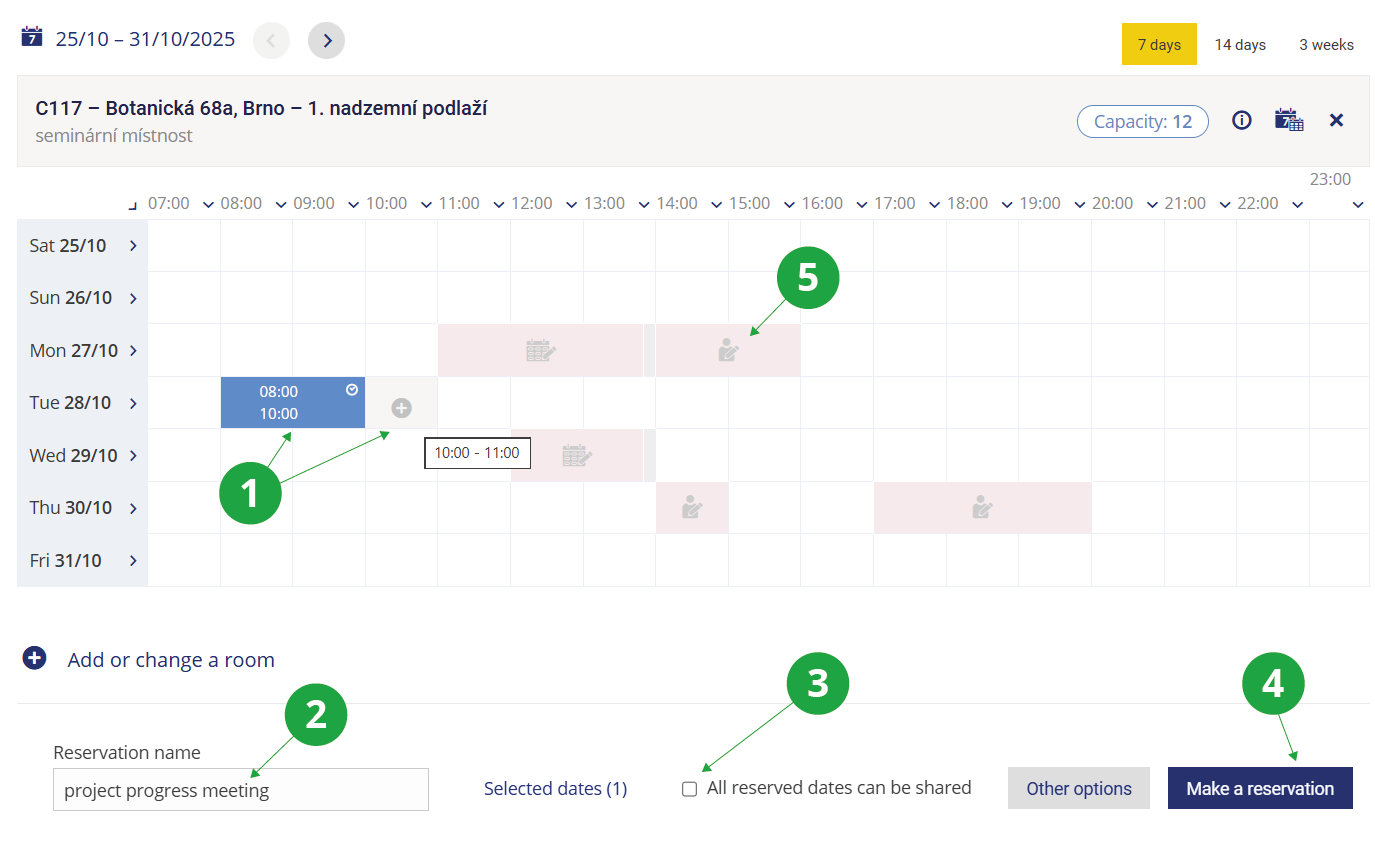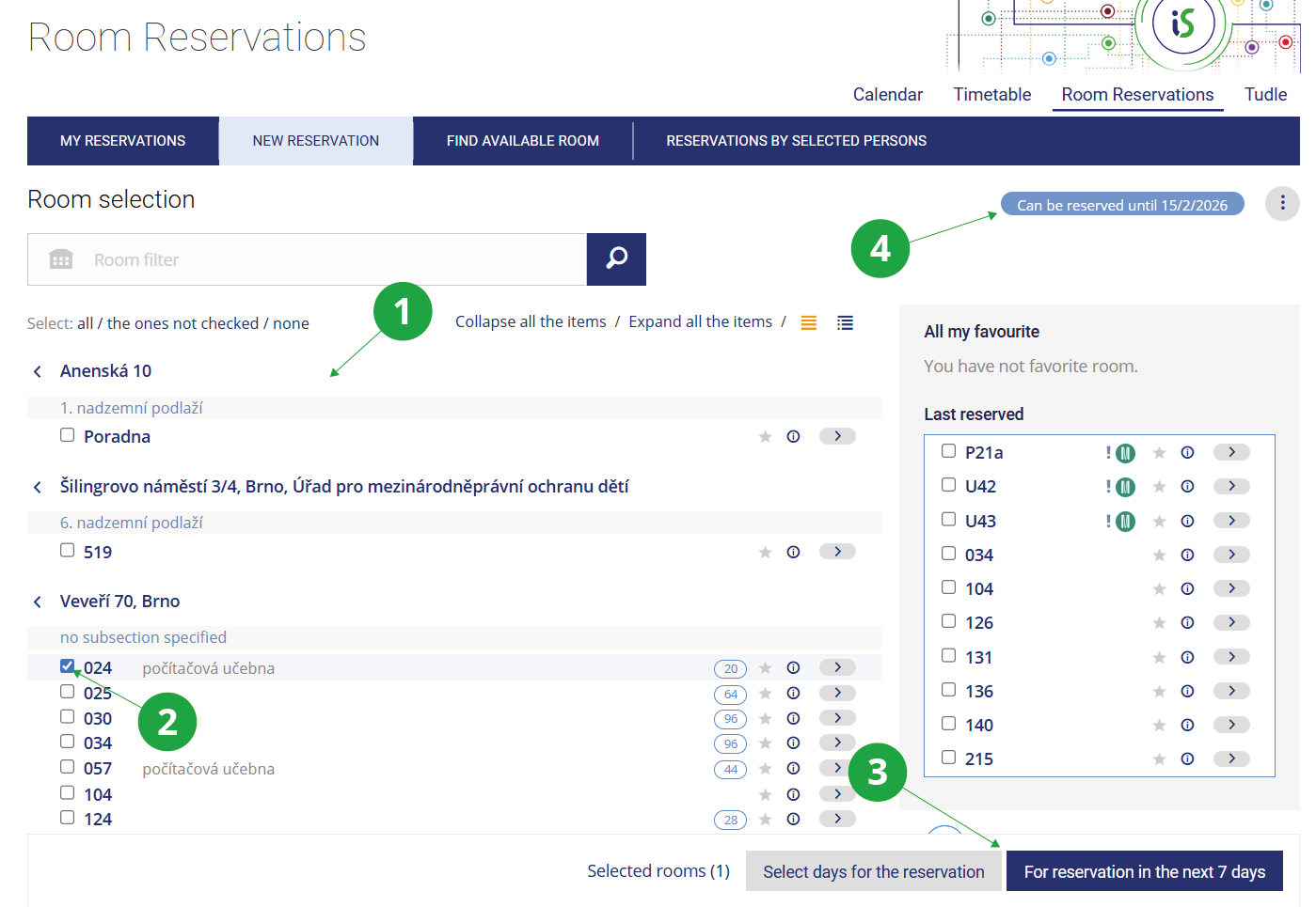 This limitation does not apply to users who have the higher-level permission s_rezerv_mist for the selected faculty, as they can make reservations beyond this date. In such cases, it is necessary to adjust the displayed date range and locate the required date manually. The restriction also does not apply to rooms marked with the attribute “Non-teaching room”. Such rooms can be reserved at any time from the current day, for the period specified in the attribute value (months or years).