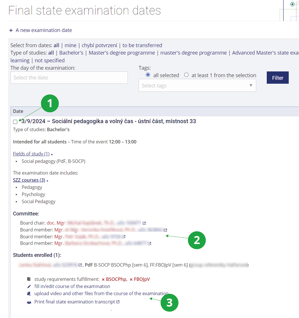 - 1.How is the course of the final state examination recorded?The course is recorded in the “Final State Examination Dates” application. In this application, the chair of the examination board, members of the examination board and the board assistant will find a link to fill in the course of the final examination. The course can be pre-filled and saved in advance, even before the date of the examination, but it is not possible to request confirmation from members of examination board at that stage. On the day of the examination, a button will become available to request the examination board’s confirmation of the course (and the grade). It is necessary to complete the course in its final form and have it confirmed by all members of the examination board. The application is available:Information system Studies (Final state examination) Final state examination dates
